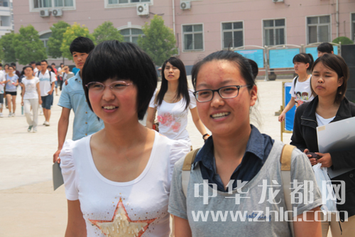 兩名考生結(jié)伴而出臉上露出輕松的笑容。(戚永/攝)