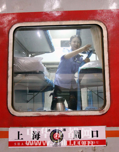 ????在K1505次列車13號車廂,記者見到了這節(jié)車廂的乘務(wù)員張靜逸。乘客一進站登車,張靜逸的工作就開始了——為乘客檢票。真正的忙碌是在乘客上車后,張靜逸負責(zé)12號和13號兩個臥鋪車廂,每個車廂核載66人,列車開出后,她要先為乘客一一換票,然后,帶上手套,拿著塑料袋,來回穿梭在列車過道中清理車廂內(nèi)的垃圾。張靜逸一路上都在重復(fù)這些工作。
