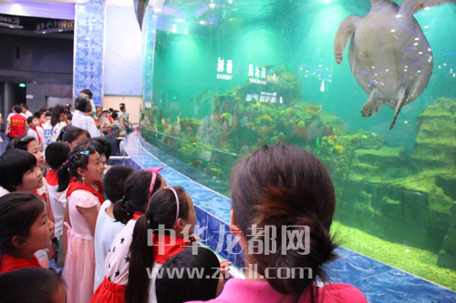????7月2日,在周口市義工協(xié)會(huì)開展的“繽紛夏日 快樂(lè)童年”公益活動(dòng)中,商水黃寨半坡店小學(xué)的30名留守兒童與周口市區(qū)的30名兒童結(jié)成友誼對(duì)子。圖為當(dāng)日孩子們一起參觀海洋館。晚報(bào)記者 張燕 攝