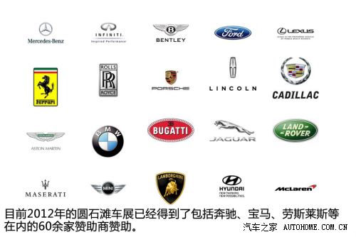 ??? 在贊助商方面,2012年的圓石灘車展到目前為止已經(jīng)有包括勞力士、蘭博基尼、寶馬、奔馳、法拉利等品牌在內(nèi)的60余家贊助商提供贊助,在現(xiàn)場你會看到很多這些品牌的廣告,當然這些品牌的廣告及贊助費的部分會被主辦方捐獻給慈善機構(gòu)。