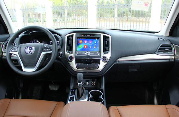 長安CS95采用大尺寸顯示屏搭配實體按鍵,兩側(cè)豎向設(shè)置了空調(diào)出風(fēng)口,按鍵排布層次分明,但略顯繁雜。新車還配有三輻式多功能方向盤,門板以及換擋桿處增加了木紋裝飾,同時提供5座和7座兩種選擇。