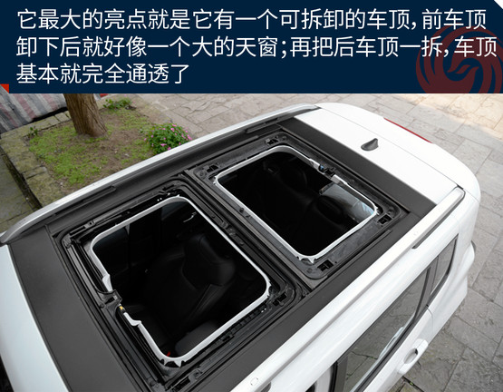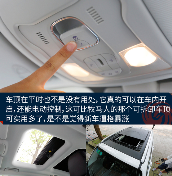 敞篷版車型將普通車型的天窗玻璃全部換成了可拆卸的頂棚,拆卸過程十分方便,即使是女性車主也能輕松拆卸。而且最重要的一點是這個頂棚不只是樣子貨,平時放在車頂時,車內(nèi)可進行操作,把它變成一個電動天窗來用,是不是感覺特高端?
