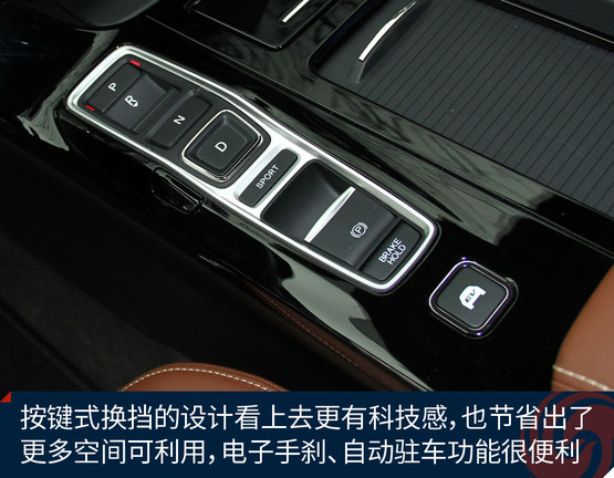 車內(nèi)采用了新的棕色真皮內(nèi)飾,而且還覺(jué)得缺了點(diǎn)什么。沒(méi)錯(cuò)!之前的排擋桿不見(jiàn)了,取而代之的是按鍵式換擋機(jī)構(gòu),看上去更有科技感,控制區(qū)也更簡(jiǎn)潔了。