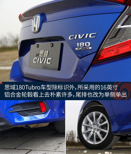 隨著思鉑睿混動(dòng)車型的推出,這次走入門路線的思域1.0T也來(lái)打了個(gè)醬油。跟之前的1.5T車型相比,外形基本保持一致。鑒于其更入門的定位,輪轂的樣式看起來(lái)沒(méi)那么精致和動(dòng)感了,尾排改為了單側(cè)單出的設(shè)計(jì),車尾的動(dòng)力標(biāo)識(shí)也有之前的“220TURBO”改為“180TURBO”。