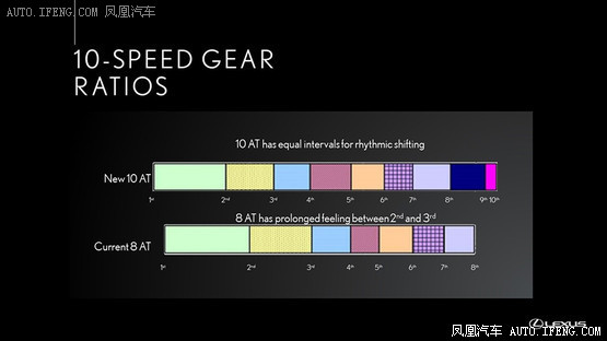 與發(fā)動機匹配的就是世界上首款10速自動變速器,這款變速器是在8檔變速器的二擋和三擋之間增加一個齒比擋位,全部10擋之間保持均勻的齒比間隔,換擋節(jié)奏感十分強,而且換擋時間僅為0.2秒,已經(jīng)達到雙離合變速器的水準。
