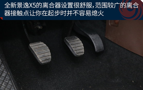對于手動(dòng)擋車型而言,除了變速器本身外,還有一個(gè)部件十分重要那就是離合器,一個(gè)調(diào)整的十分舒適的離合器可以給駕駛者帶來更好的駕駛感受。全新景逸X5的離合器設(shè)置很舒服,雖然從腳感來說,它的離合器設(shè)定有些偏沉,但不要擔(dān)心,范圍較廣的離合器接觸點(diǎn)讓你在起步時(shí)并不容易熄火。