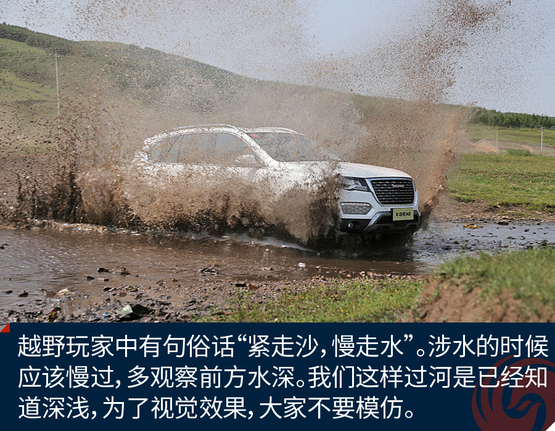 ????????涉水測試對于新哈弗H8來說簡直是小菜一碟,190mm的離地間隙,500mm的最大涉水高度,這條小河完全阻擋不了H8的腳步。俗話說“緊走沙,慢走水”是對于路況不清楚的水域,萬一進氣系統(tǒng)進水,發(fā)動機就會熄火。所以一定要小心涉水深度。像我們這么莽撞的壓水花,是在水域已經(jīng)探明的情況下。