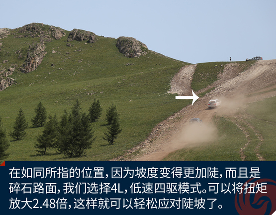 ????????經(jīng)過刺激的涉水越野,我們終于來到了此行最難的挑戰(zhàn)地,傳奇大坡。這條上山的土路從圖片上看起來不陡,實際上已經(jīng)達到了45%的坡度。人爬起來都氣喘吁吁。而且難度大的原因是兩點,一個是超長距離的大上坡,另一個是后端是碎石路面。你想靠沖坡根本行不通,如果動力不足最終是無法登頂?shù)摹8不僅動力充沛而且有4L,低速四驅(qū)模式,而且博格華納雙速TOD可以隨時分配動力傳遞到前后軸,保障了有抓地力的輪胎有驅(qū)動力。