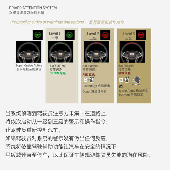 ????????若這個級別的警示還不能“喚醒”駕駛者,超級巡航系統(tǒng)將自動開啟雙閃、利用車輛輔助駕駛系統(tǒng)控制汽車逐漸減速并在路邊停車,然后OnStar安吉星工作人員將會通過遠程對話介入以防止駕駛者因為“失能”造成更多不可預(yù)知的危險。
