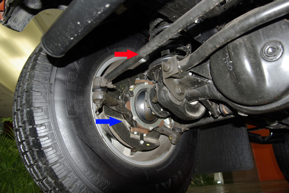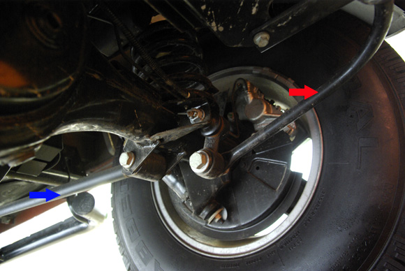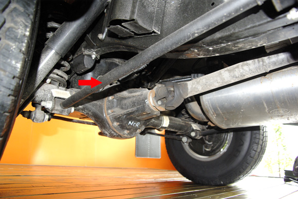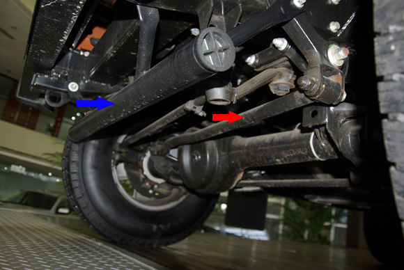 ????衛(wèi)士的后軸采用拖臂式后懸,紅色箭頭所指的拉桿就是拖臂。左右各一根,拖臂及避震機(jī)對(duì)后軸的自由度進(jìn)行控制,后軸相對(duì)車(chē)架的位置和自身的扭轉(zhuǎn)都得到了控制。