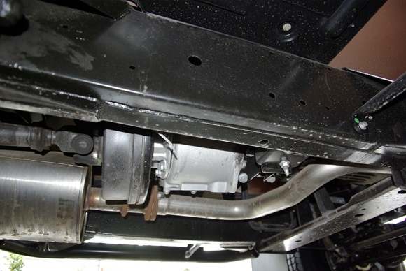 ????衛(wèi)士的大梁及中央差速器特寫(xiě),圖中可以看到衛(wèi)士的大梁非常的厚實(shí)粗壯。