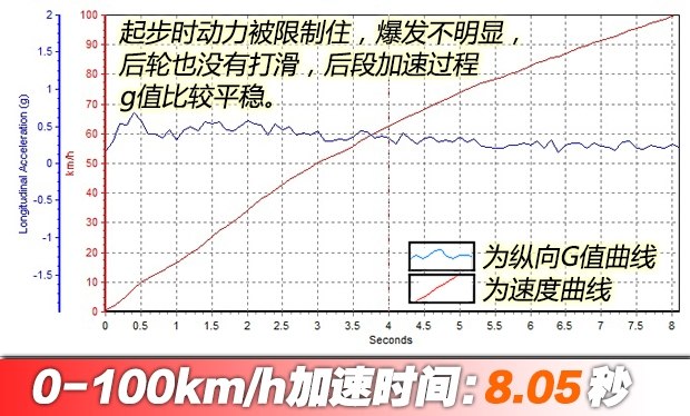????雖然可以關(guān)閉穩(wěn)定系統(tǒng),但感覺卻對發(fā)動機輸出非常保守,變速箱也不允許拉到很高的轉(zhuǎn)速。起步后車輪沒有明顯滑動,說明并沒有達到最佳輸出狀態(tài),最終成績?yōu)?.05秒,成績與老款車型有差距,略有遺憾。