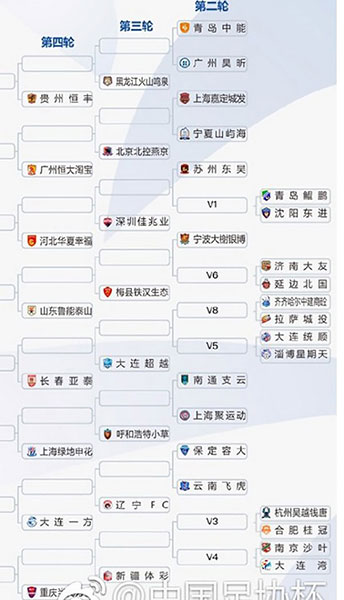 第四輪開始16支中超球隊加入角逐,加上從第三輪晉級的16支球隊,共32支球隊參賽,中超球隊自動落位相應客場簽位,其中廣州恒大、上海申花、上海上港和天津權健4支亞冠球隊將分別落位在A、B、C、D區(qū),這4支球隊在半決賽之前不會相遇。