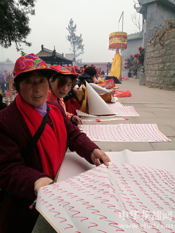 大霧的確延緩了香客的腳步,這也讓晚來的記者得以看到祭拜的盛景。女媧陵前,十幾名身著統(tǒng)一緞面紅襖,穿黑棉布鞋的女客正在結(jié)伴焚香祭拜,口音明顯和當(dāng)?shù)厝瞬煌K齻兪菑木辔魅A300多公里的濮陽范縣、臺(tái)前縣來的,說是凌晨2時(shí)就起身出發(fā),大霧中不僅遭遇堵車,還迷了路,到女媧城都快8時(shí)了。她們這次一起來的有30多人,分乘4輛車。就像往常前來一樣,她們?cè)谂畫z城要焚香、跪拜、“寫賬”(在紙上畫符,敬奉女媧的一種民間形式)、“守功”(在大殿靜坐,以示對(duì)女媧親近),直至下午方回?!拔覀兠磕炅鲁跻缓团D月初一都來,為啥?信奉女媧娘娘唄,不來不舒服?!逼渲幸晃豢仔障憧透嬖V記者。