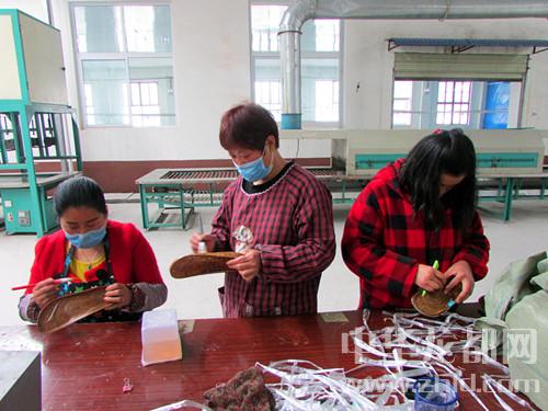 卞路口鄉(xiāng)高山店村的一家鞋廠,留守婦女正在加工鞋底。該縣在扶貧攻堅中,通過實施資金幫扶、技術(shù)培訓(xùn)等措施幫助貧困群眾、返鄉(xiāng)農(nóng)民工創(chuàng)辦玩具廠、制鞋廠等微型企業(yè),為周邊群眾提供了就業(yè)崗位。