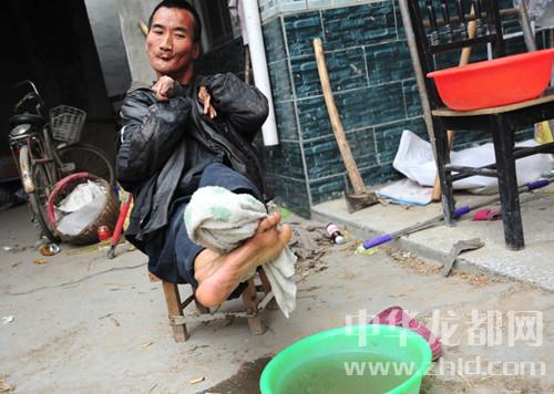 “這孩子40多年來(lái),沒住過院,沒打過針,頭疼發(fā)燒會(huì)給媽媽示意,拿幾片藥一吃就好,這孩子命硬,一冬天也不洗回澡,到夏天爸爸媽媽幫他洗洗,有時(shí)候衣服一月才換一次。”鄰居張大媽說道?,F(xiàn)在紅印可以靈活的用雙腳幫媽媽做一些事情了。
