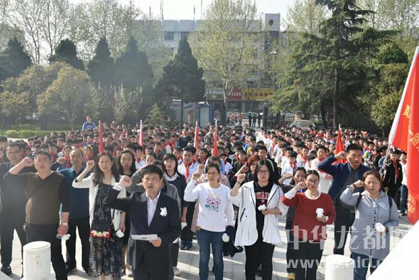 上午八點(diǎn)半,400余名學(xué)生衣著整潔,佩戴紅領(lǐng)巾,手握自備白花,排著整齊的隊(duì)伍從學(xué)校出發(fā),懷著對(duì)烈士無(wú)限崇敬的心情來(lái)到周口烈士陵園,佇立在傲然聳立的烈士紀(jì)念碑前,莊嚴(yán)肅穆的悼念活動(dòng)開(kāi)始了。升國(guó)旗、唱國(guó)歌、敬隊(duì)禮,黨員教師在烈士紀(jì)念碑前重溫入黨誓詞,少先隊(duì)員代表向烈士墓敬獻(xiàn)花圈,全體師生向烈士鞠躬默哀。