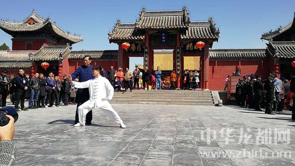 研討會(huì)前,王西安大師率弟子在淮陽(yáng)太昊陵廟太極門(mén)前向海內(nèi)外太極拳愛(ài)好者傳授拳術(shù)。