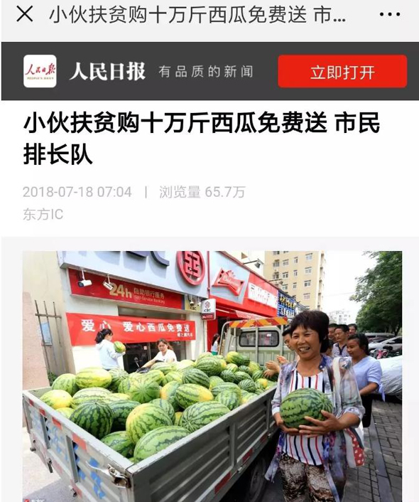 7月18日,《人民日?qǐng)?bào)》客戶(hù)端播發(fā)了“小伙購(gòu)十萬(wàn)斤西瓜免費(fèi)送 市民排長(zhǎng)隊(duì)”的一條新聞,瞬間刷屏朋友圈,一天閱讀量就突破100萬(wàn)人次,加上騰訊新聞、人民圖片截至19日發(fā)稿時(shí)閱讀量已達(dá)一百五十萬(wàn)人次,評(píng)論13000多條,人們都在稱(chēng)贊咱扶溝小伙宋鐵托的善舉,被網(wǎng)友稱(chēng)他為“愛(ài)心西瓜哥”。