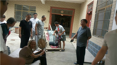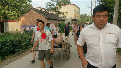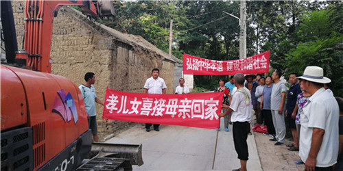 當(dāng)日早上,秋渠鄉(xiāng)高小橋行政村牛橋和孫大莊自然村,鄉(xiāng)村干部打著橫幅、孝順兒、媳胸帶紅花,用架子車?yán)先?,后面跟著圍觀的村民,通過隆重“接老人回家”活動,激勵更多人孝老愛親。