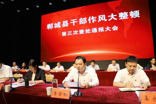 8月15日下午,鄲城縣召開(kāi)干部作風(fēng)大整頓第三次查處通報(bào)大會(huì)。貫徹全市干部作風(fēng)大整頓查處通報(bào)會(huì)議精神和縣委十二屆四次全會(huì)暨縣委工作會(huì)議精神,通報(bào)典型案例,宣布處理決定,傳導(dǎo)工作壓力,夯實(shí)工作責(zé)任,為進(jìn)一步推進(jìn)各項(xiàng)工作任務(wù)落實(shí)、打好打贏脫貧攻堅(jiān)戰(zhàn)提供堅(jiān)強(qiáng)有力的作風(fēng)保障??h委書(shū)記羅文閣發(fā)表講話,縣長(zhǎng)李全林主持。全縣副處級(jí)以上領(lǐng)導(dǎo)干部和縣、鄉(xiāng)、村各級(jí)各部門負(fù)責(zé)人參會(huì)。