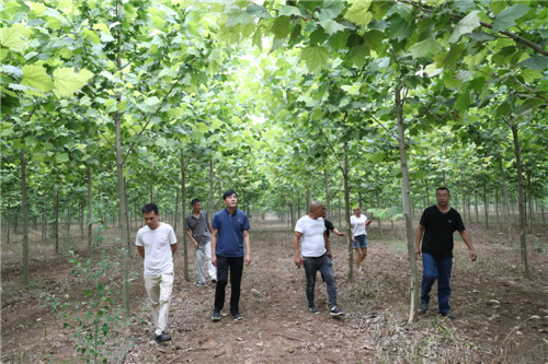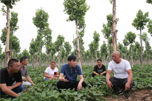 與前廟相鄰的大張村,是一個(gè)“天然大氧吧”。從大張村走出來(lái)的曹紅星在鄭州從事園林綠化多年,在朱口鎮(zhèn)黨委、鎮(zhèn)政府的支持和鼓勵(lì)下,他以1000元/畝的價(jià)格流轉(zhuǎn)了1000多畝土地,種植法桐、欒樹(shù)、國(guó)槐等綠化樹(shù)。有著豐富經(jīng)驗(yàn)的曹紅星在種植綠化樹(shù)的同時(shí),積極發(fā)展林下經(jīng)濟(jì),在綠化樹(shù)下種植紅薯、大蒜等,有效提高了土地的利用率,經(jīng)濟(jì)效益顯著提高。“平時(shí),綠化林地除草、抗旱、施肥需要用工,收種紅薯、大蒜等也需要用工,用工時(shí)貧困戶優(yōu)先。只要有勞動(dòng)能力,來(lái)這里就能掙錢(qián)。”曹紅星說(shuō),林業(yè)經(jīng)濟(jì)的快速發(fā)展為鄉(xiāng)親們脫貧致富提供了保障。