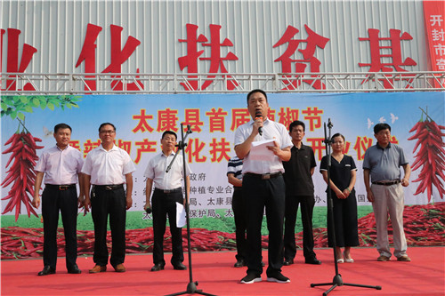 8月22日,太康縣首屆辣椒節(jié)暨辣椒產(chǎn)業(yè)化扶貧基地現(xiàn)場會在龍曲鎮(zhèn)紅云來辣椒產(chǎn)業(yè)扶貧基地召開。太康縣人大副主任、黨組副書記竇勝利,縣政府副縣長張國慶,縣公安局局長李根闖等領導和相關人員出席會議。竇勝利宣布開幕,張國慶講話并致辭,會議由龍曲鎮(zhèn)黨委書記趙云華主持。