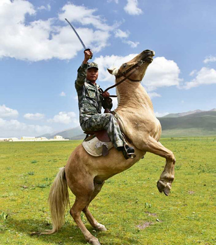 “一開始就‘認(rèn)慫’,哪還有一點(diǎn)騎兵精神可言?!壁w雪超暗自打氣。打那以后,趙雪超像根上緊的發(fā)條,和戰(zhàn)馬較上了勁。他晚上練劈刺,白天練馬術(shù)動(dòng)作,被馬一次次地摔下去,他拍掉身上的塵土又一次次地躍上馬背……就是憑借這股不服輸?shù)捻g勁, 3個(gè)月后,趙雪超的訓(xùn)練成績?cè)谶B隊(duì)名列前茅。