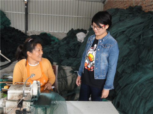 10月18日,商水縣黃寨鎮(zhèn)草樓村的縣人大代表羅林林(右)向留守婦女張大平了解漁網(wǎng)網(wǎng)面生產情況。