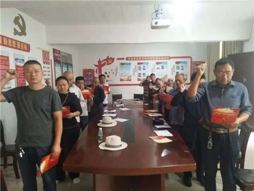 “我志愿加入中國(guó)共產(chǎn)黨,擁護(hù)黨的綱領(lǐng),遵守黨的章程,履行黨員義務(wù)……”在汲水鄉(xiāng)張嶺行政村室,汲水鄉(xiāng)黨委副書記王申帶領(lǐng)全體黨員面對(duì)黨旗,一起重溫入黨誓詞,并學(xué)習(xí)黨章黨規(guī)。