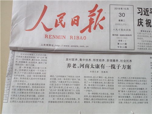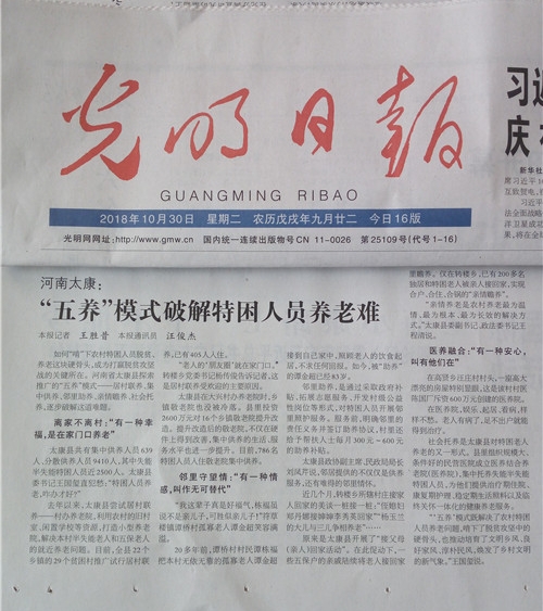 為助力脫貧攻堅,有效提高農(nóng)村特困老人整體供養(yǎng)水平,太康縣民政局、縣扶貧辦等部門在縣委、縣政府正確領(lǐng)導(dǎo)下,按照“一戶一策、一人一法”原則,創(chuàng)新實(shí)施集中供養(yǎng)、親情贍養(yǎng)、社會托養(yǎng)、居村聯(lián)養(yǎng)、鄰里助養(yǎng)“五養(yǎng)”模式,有效破解了特困老人的脫貧和養(yǎng)老難題。該做法經(jīng)《周口日報》率先報道后,國家級、省級媒體紛紛慕名前往太康采訪。截至目前,百余家媒體或網(wǎng)站相繼報道了太康“五養(yǎng)”模式。10月30日,《人民日報》《光明日報》分別以《養(yǎng)老,河南太康有了一攬子方案》《河南太康:“五養(yǎng)”模式破解特困人員養(yǎng)老難題》為題重磅介紹了太康“五養(yǎng)”模式經(jīng)驗(yàn)。10月30日,人民日報海外版官方網(wǎng)站還以《河南太康:“五養(yǎng)”模式來了 特困人員笑了》為題作了報道。據(jù)了解,國家級3家主流媒體同一天內(nèi)報道同一工作經(jīng)驗(yàn),在太康縣宣傳史上尚屬首次。