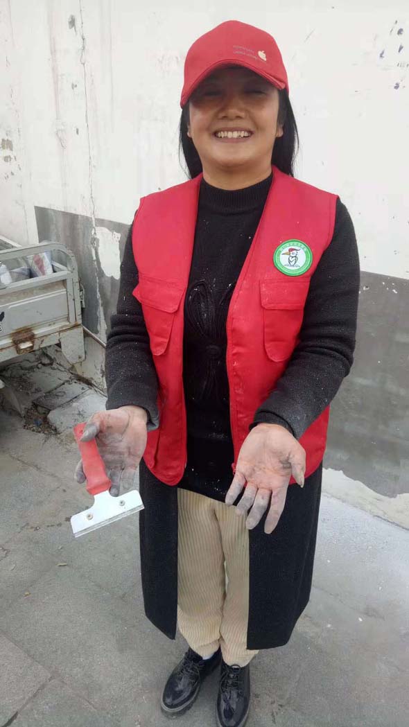 周口市啄木鳥志愿者服務(wù)工作委員會臨時黨支部書記、周口市慈孝文化促進會會長孫彩云更是不怕臟,不怕累,連個手套都不帶,直接用雙手拿著鏟刀或者抹布清理墻上的小廣告,最后弄得雙手和滿身都是污漬?!盀榱宋覀兊某鞘懈粒鳛橐幻驹刚?,就應(yīng)該不怕累,不怕苦。”