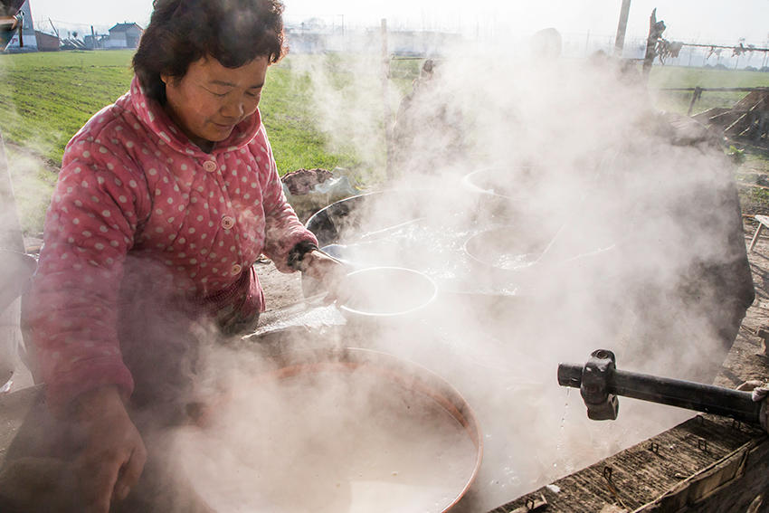 在田間搭棚做粉皮的村民
