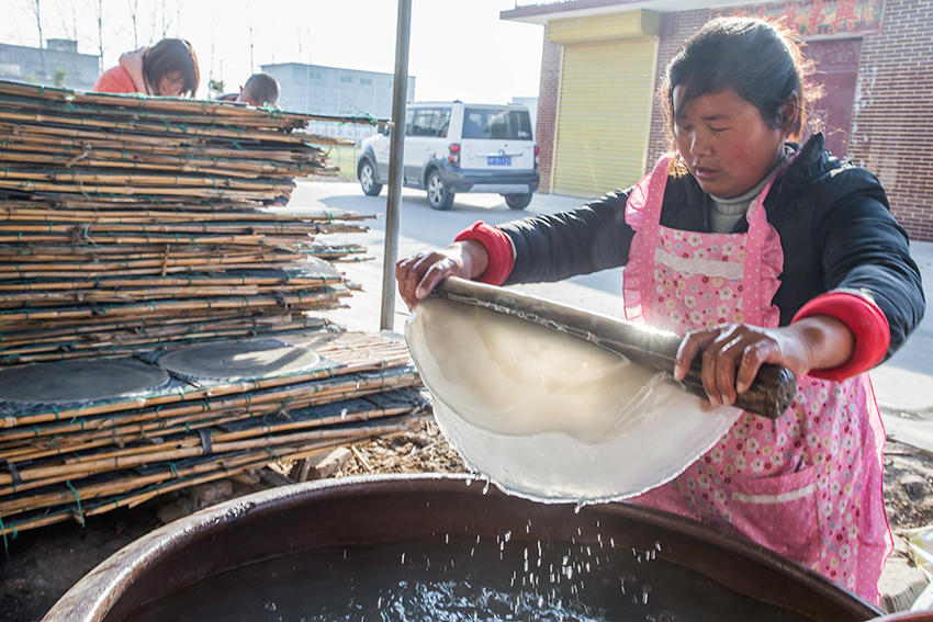 該村地處豫皖兩省交界處,是一個聞名遐邇的粉皮加工專業(yè)村。村里人手工做粉皮已有近百年歷史,從事粉皮加工的村民達500多人。 來到這里,您可以看到手工做粉皮的全過程。(王天定文/圖)