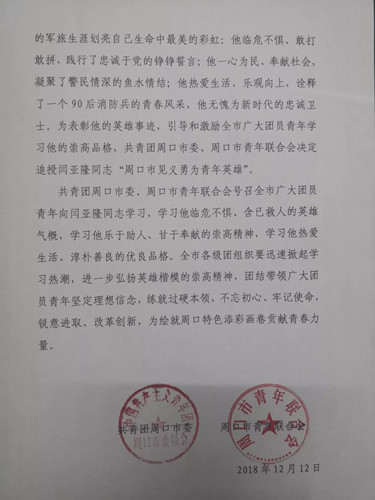 12月13日,記者從鄲城縣團(tuán)縣委獲悉,為表彰閆亞隆同志的英雄事跡,引導(dǎo)和激勵(lì)全市廣大團(tuán)員青年學(xué)習(xí)他的崇高品格,共青團(tuán)周口市委、周口市青年聯(lián)合會(huì)追授閆亞隆同志“周口市見義勇為青年英雄”稱號(hào)。
