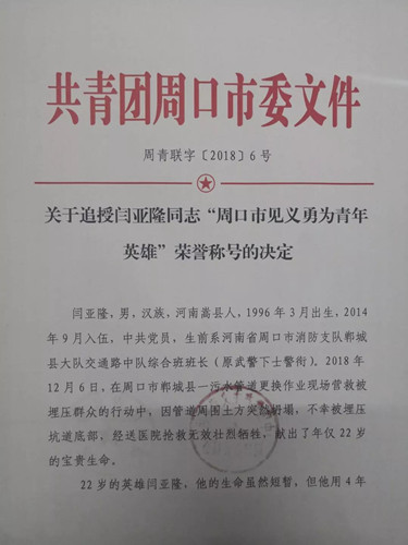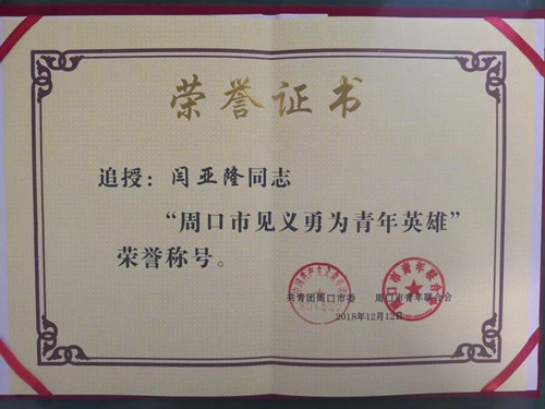 閆亞隆同志被追授“周口市見義勇為青年英雄”榮譽(yù)稱號(hào)