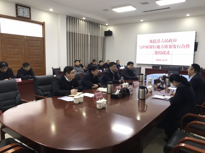 12月17日,鹿邑縣人民政府與中原銀行地方債券發(fā)行合作簽約儀式舉行。縣委常委、常務(wù)副縣長(zhǎng)陸志杰,老子學(xué)院黨組副書記、交通局局長(zhǎng)王初立,中原銀行周口分行黨委副書記、副行長(zhǎng)周朝陽出席簽約儀式??h財(cái)政局、教體局、住建局、林業(yè)局、發(fā)改委、老子文化產(chǎn)業(yè)園及投資公司等相關(guān)單位負(fù)責(zé)同志參加會(huì)議。