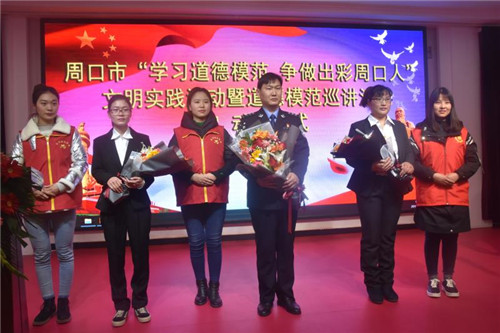市公安局交警王凱偉是2018年敬業(yè)奉獻(xiàn)類中國好人,省五四獎(jiǎng)?wù)芦@得者,經(jīng)常參加公益活動,持續(xù)幫助貧困女孩小夢麗和她家人,用善舉挽救了這個(gè)貧困家庭。扶溝縣曹里鄉(xiāng)刁灣小學(xué)教師李艷琴扎根鄉(xiāng)村教育一線無怨無悔,數(shù)年如一日照顧癱瘓?jiān)诖驳钠牌湃蝿谌卧?,曾獲縣最美鄉(xiāng)村老師稱號。鹿邑伯陽中學(xué)“90后”女教師劉交交剛參加完高考后父親因病去世,母親身患?xì)埣?。她不向命運(yùn)低頭,靠打工收入和微薄的助學(xué)金維持生活和學(xué)業(yè),為照顧母親,她攜母上大學(xué),曾獲中國大學(xué)生自強(qiáng)之星等稱號,被授予省五四獎(jiǎng)?wù)隆H坏赖履7峨m然都是最平凡的人,但都有一顆不平凡的心,他們的感人事跡散發(fā)著奪目的光芒,深深感染了現(xiàn)場的每一位聽眾,不少人流下了感動的淚水。