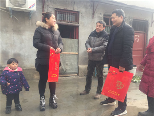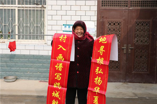 1月16日,西華縣艾崗鄉(xiāng)鐵爐村村民馬永清接過該縣縣委宣傳部駐村扶貧干部送來的春聯(lián)喜上眉梢。據(jù)了解,今年春節(jié)前夕,該縣財(cái)政投入200余萬元購置80萬副春聯(lián)在全縣鄉(xiāng)村范圍內(nèi)廣泛開展贈(zèng)春聯(lián)、送祝?;顒?dòng)。