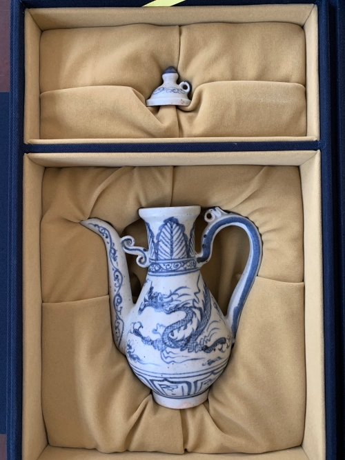 記者注意到,這件海撈元代青花瓷器,保存完整,造型美觀。瓷器中部繪有一條在云中翻飛的龍,口沿上部飾蕉葉紋,底部有蓮瓣紋,器物完整,造型精美。據(jù)了解,“海撈瓷”是收藏市場上對于從海底打撈出水的瓷器的一種稱謂,特指古代“海上絲綢之路”和“海上香瓷之路”開始以后,中國對外貿(mào)易途中,在南海海域觸礁沉船所遺留的各類外銷陶瓷。市博物館館長周建山介紹,在歷史上,中國著名的瓷器就是經(jīng)由“海上絲綢之路”銷往各國,這些“海撈”不但具有文物歷史價(jià)值,還反映中國人通過這條海上絲綢之路,走向世界各地的重要證據(jù)。