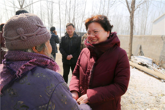 2018年5月11日,張穎波在看望大新鎮(zhèn)陳樓村的困難群眾吳鳳蓮時,曾對她說過一句話,“等你新房蓋好,我再來看你?!保罚稓q的吳鳳蓮把這句話牢牢地記在了心里。一見張穎波的面,拉著手留著淚連聲說:“俺家房早就蓋好了,就一直盼著恁來。我知道恁忙,可就想讓恁看看俺的房……”老人和一位患病的兒子一起生活,去年5月份張穎波來時,她家正因“危房清零”活動而扒掉舊房蓋新房。張穎波當(dāng)時還特意滿足了老人的一個愿望,安排村干部為她家房內(nèi)專門壘個隔斷。“我70多了,從來沒住過這么好的房、從來沒過過這么好的日子!”新建的三間磚瓦房、一間配套齊全的廚房和壘好的院墻讓老人感慨不已,發(fā)自肺腑地說著黨和政府的好。“老人家,我今天就是想看看房子改造的怎樣,也給你拜個早年?!睆埛f波拉著吳鳳蓮老人的手說:“房子蓋好了,也算了了你的一個心愿,有黨和政府的幫助,日子會越來越好。你要照顧好自己和孩子,有啥困難就找村里干部。”