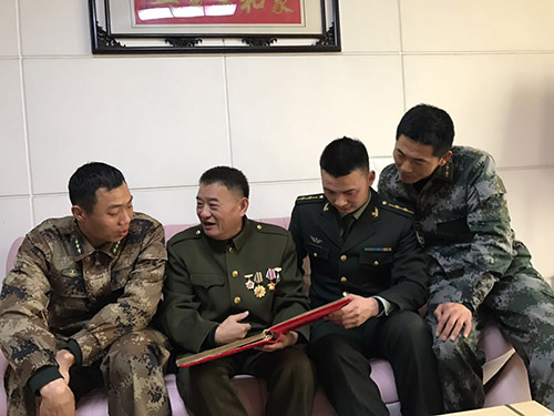 柳東坡、劉威、崔二偉3名年輕軍官聽完老英雄的講述后心靈受到極大震撼,一度落下激動地淚花。他們向海水干匯報了各自在部隊立功受獎的情況?!皬娷娤蠕h”柳東坡現(xiàn)為80集團軍某旅副營長,在斯洛伐克國際特種兵比武、中俄聯(lián)演以及全軍特種兵比武中表現(xiàn)優(yōu)異,先后榮立一等功、二等功各一次,三等功3次;“天山兵王”劉威現(xiàn)任新疆軍區(qū)某團副連長,在國際軍事比賽、軍區(qū)偵察兵比武中脫穎而出、成績顯著,入伍來先后榮立一等功、二等功各一次,三等功2次;“狙擊神槍手”崔二偉曾被總參謀部表彰為“全軍優(yōu)秀狙擊手”,先后榮立一等功、二等功各一次。