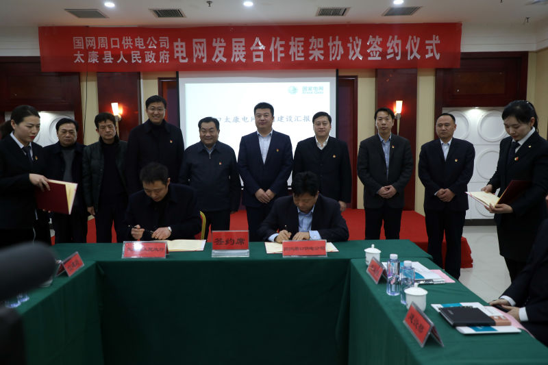 2月13日,太康縣人民政府與周口市供電公司舉行電網(wǎng)發(fā)展合作框架協(xié)議簽約儀式。周口市供電公司總經(jīng)理郭雷、副總經(jīng)理靳玉林,紀委書記、工會主席張浩,太康縣領導王國璽、董鴻、喬偉等出席簽約儀式??h委常委、縣委辦公室主任董鴻主持簽約儀式。