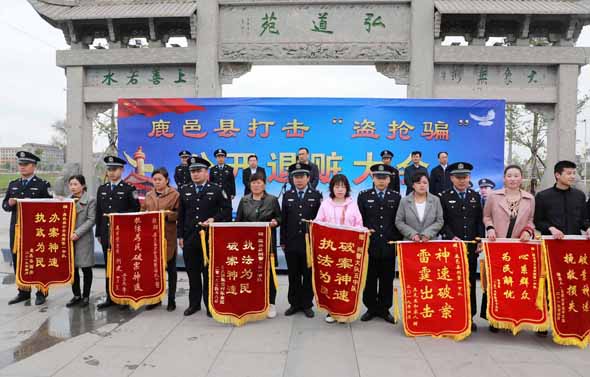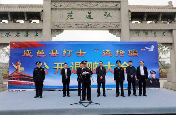 4月25日上午,鹿邑縣召開(kāi)打擊“盜搶騙”專項(xiàng)行動(dòng)公開(kāi)退贓大會(huì)??h委常委、政法委書記侯自峰出席會(huì)議并講話??h公、檢、法、司等有關(guān)部門負(fù)責(zé)人與群眾代表近300人參加退贓大會(huì)。