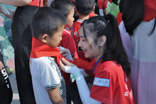 開班儀式上,鄭州升達經貿管理學院的支教老師為同學們佩戴了紅領巾,伴隨著國歌進行了升國旗教育,支教老師進行集體宣誓。支教老師代表作表態(tài)發(fā)言時說:“很高興能夠來鹿邑周樓小學支教,作為一名當代青年大學生,我們能夠擔當重任,吃苦耐勞,全身心地完成兩周的支教活動,與孩子們快樂相處?!?/p>