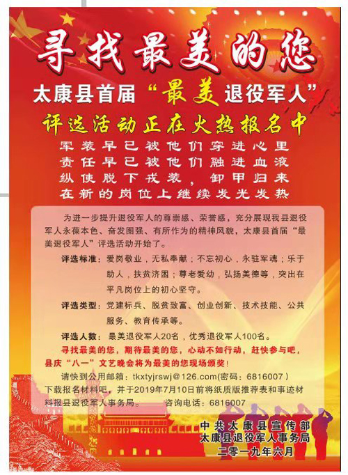 為進一步提升退役軍人的尊崇感、榮譽感,充分展現(xiàn)全縣退役軍人永葆本色、奮發(fā)圖強、有所作為的精神風貌,太康縣委宣傳部、太康縣退役軍人事務(wù)局從即日起聯(lián)合開展首屆“最美退役軍人”評選活動,對全縣退役軍人中涌現(xiàn)出來的黨建標兵、脫貧致富、創(chuàng)業(yè)創(chuàng)新、技術(shù)技能、公共服務(wù)、教育傳承等方面典型代表進行評選表彰。