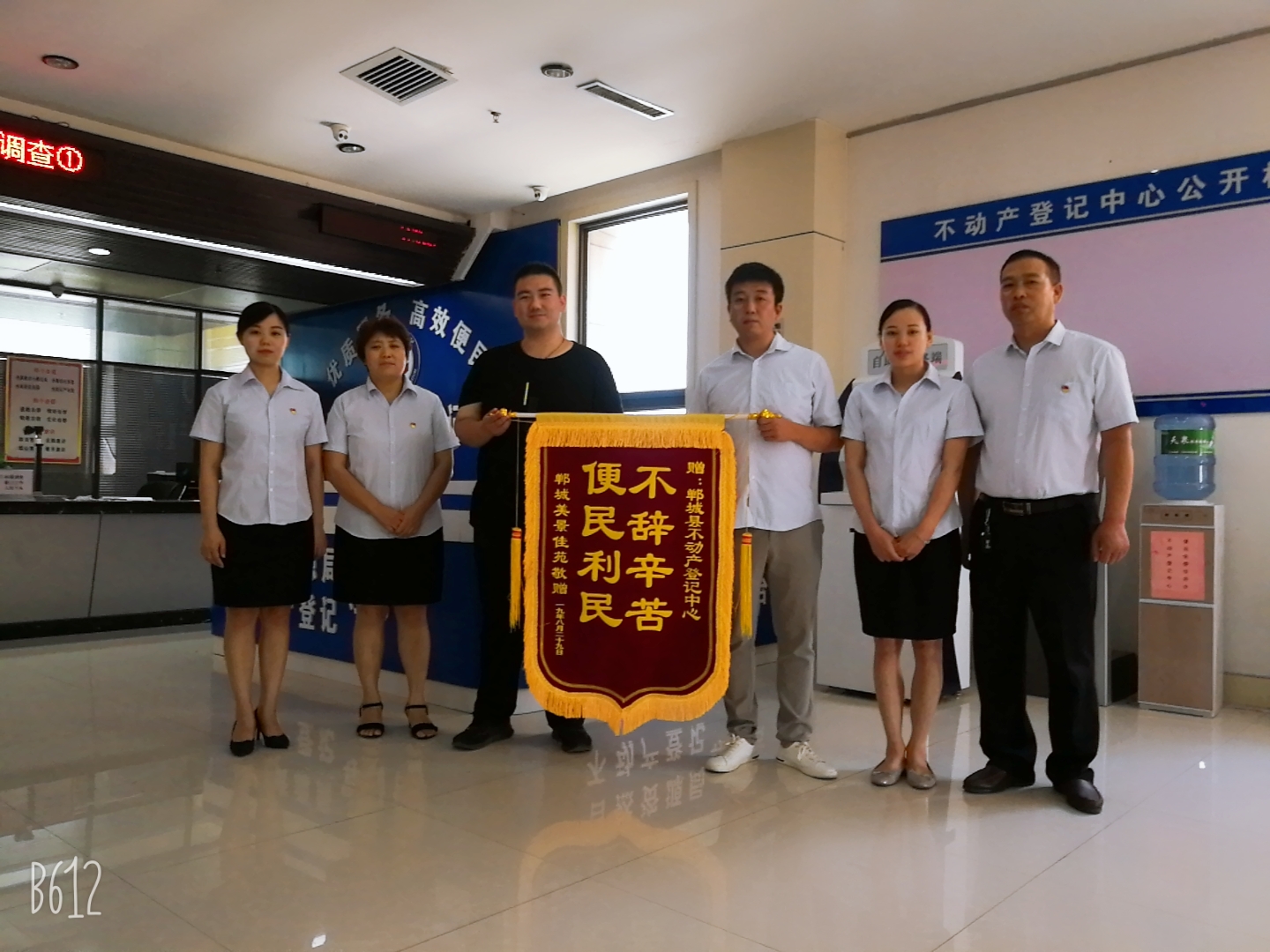 近日,河南博騏置業(yè)有限公司工作人員來到鄲城縣不動產(chǎn)登記中心,將一面印有“不辭辛苦,便民利民”的錦旗送到了中心負(fù)責(zé)人手中,對不動產(chǎn)登記中心真心為民的服務(wù)態(tài)度和高效的辦事效率表示感謝,點贊窗口“熱情、文明、高效”的服務(wù)。