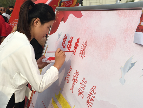 9月29日上午,來自我市各界的青聯(lián)委員及青年代表共同參與“祝福香港 點贊祖國”活動?;顒蝇F(xiàn)場,大家紛紛與國旗合影,并在簽名墻上寫下祝愿祖國的話語。
