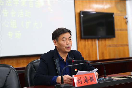 11月26日晚,太康縣在縣委綜合樓召開縣委理論學(xué)習(xí)中心組(擴(kuò)大)“不忘初心、牢記使命”主題教育夜校法治宣講活動專場報(bào)告會。河南工業(yè)大學(xué)法學(xué)院教授、博士生導(dǎo)師譚波作《依法治縣與法治太康建設(shè)》專題講座??h委副書記、縣委政法委書記劉海艇主持會議??h副處級以上領(lǐng)導(dǎo)干部,縣直各單位黨政正職,縣委各部委辦副職,各鄉(xiāng)鎮(zhèn)鄉(xiāng)鎮(zhèn)長,人大、政協(xié)機(jī)關(guān)各委室主任、副主任共100余人參加會議。