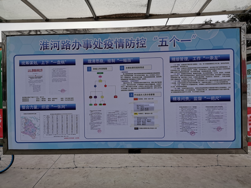 淮河路辦事處地處我市東南部,總?cè)丝诩s4萬。轄區(qū)黃灘、孟營、鄭洼、牛灘、劉新莊、姚灘、南徐、路莊、趙寨、麥仁店、康樓、徐莊等12個居委會,有34個自然村,114個村民組,人口約39000人、面積20平方公里。根據(jù)轄區(qū)的實疫情防控工作,淮河路辦事處探索出一套疫情防控工作“五個一”流程。統(tǒng)籌謀劃,上下“一盤棋”; 整合力量,織密“一張網(wǎng)”; 理清思路,繪制“一幅圖”;精細管理,工作“一條龍”;精準問責(zé),監(jiān)督“一把尺”。